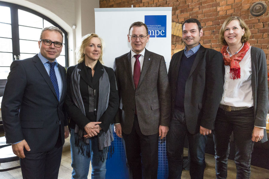 Ministerpräsident Bodo Ramelow mit Vorstandsmitgliedern des Mitteldeutschen Presseclubs. (vlnr.: Wolfgang Brinkschulte, Susanne Odenthal, Bodo Ramelow, Frank Viereckl, Birgit Binder)