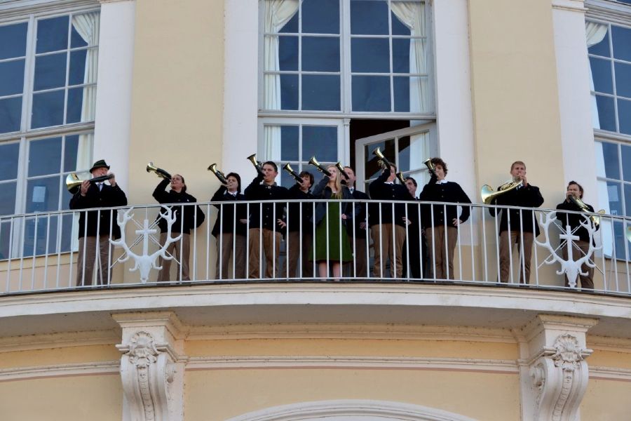 Das Schloss in der strahlenden Nachmittagssonne, dazu die Klänge der Jagdhornbläser: Es gab viele stimmungsvolle Momente bei der Tour zum Schloss Hubertusburg. Rund 80 Teilnehmer waren am 27. September beim 2. Tourismusfrühstück on Tour dabei. Eingeladen hatten die LTM (Leipzig Tourismus Marketing GmbH), die Kongressintiative “Do-it-at-leipzig.de” und der Mitteldeutsche Presseclub. Vor er Ankunft im Schloss Hubertusburg standen ein Besuch am Horstsee, einem der Wermsdorfer Seen, und eine Fahrt mit der Döllnitzbahn, dem “Wilden Robert”, auf dem Programm. In kurzen Gesprächsrunden im Ovalsaal des Schlosses gab es detaillierte Informationen zur Zukunft des Schlosses, dem übergreifenden Tourismuskonzept von Leipzig und seinem Umland und der überaus erfolgreichen Sonderausstellung “Die königliche Jagdresidenz Hubertusburg und der Frieden von 1763”, die bis zum 3.11.2013 verlängert wurde. Ein Besuch der Ausstellung und eine exklusive Führung durch Teile des Schlosses, die normalerweise dem Publikum verschlossen bleiben, waren die abschließenden Höhepunkte des Besuchs in Wermsdorf. (Foto: Bernd Görne)